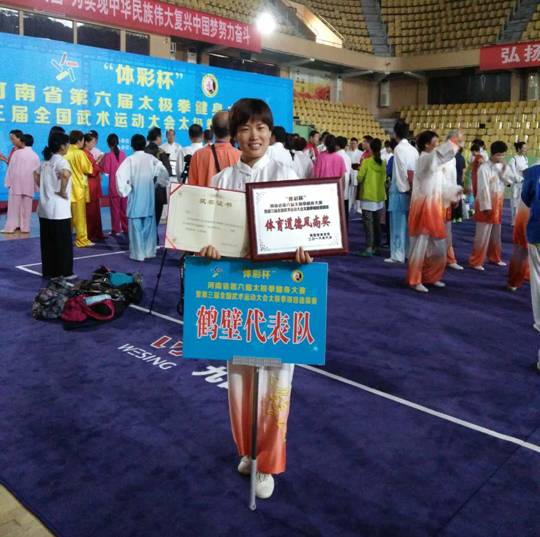 2018年6月13日,由河南省体育局主办,河南省武术运动管理中心、焦作市体育局承办的“体彩杯”河南省第六届太极拳健身大赛暨第三届全国武术运动大会太极拳项目选拔赛在焦作市体育馆举行,来自全省各地25支代表队的337名太极拳爱好者参加了此项比赛。我校秦瑞瑞老师代表鹤壁市代表队参加本次比赛,并在比赛中取得个人太极刀二等奖,集体太极拳二等奖及体育道德风尚奖称号。